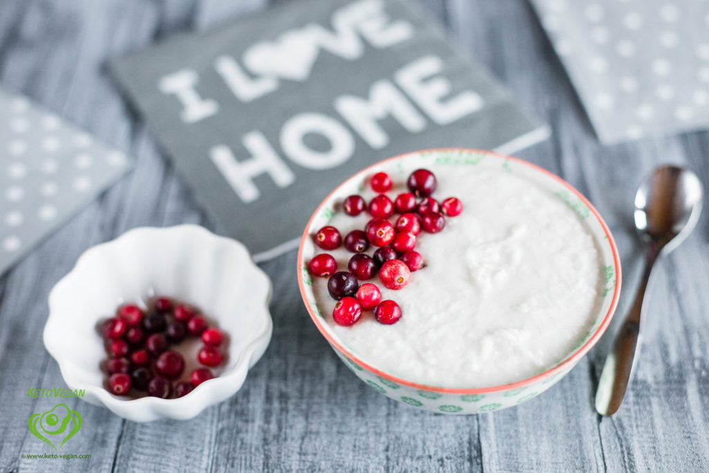 For making this yogurt, you basically need just 3 ingredients: coconut cream, lemon juice, and psyllium husk powder. However, I always add some stevia and probiotics to my yogurt. Moreover, I mix a scoop of unflavored (or vanilla-flavored and stevia-sweetened) rice protein just before I’m planning to eat it. Like that, there is substantial protein as well. Rice protein made from sprouted brown rice is a complete protein, i.e. it contains all the essential amino acids. Moreover, it’s gentle on the stomach, unlike for example pea protein or soy protein (you’ll never see soy protein in my kitchen! In my opinion all soy products, except fermented soy products, should be banned immediately!). Moreover, I also add a handful of berries for extra flavor and vitamins. Cranberries and raspberries are the lowest in carbs. Go for wild berries if you can, as the farmed berries are bred and thus contain more natural sugar and less vitamins.